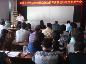首先,院党委书记钟绍峰同志代表学院党委作动员讲话,就学习贯彻中央和学校的文件精神,如何组织开展好学院教育实践活动提出了三点意见:1、统一思想,凝聚共识,深刻认识开展教育实践活动的重要意义。2、把握要求,明确责任,务实高质量完成教育实践活动的各项任务。3、加强领导,精心组织,确保教育实践活动取得实效。他最后强调,务必将此次活动的开展落到实处,真抓实干, 使全院风貌进一步有大的改观,进一步营造人文关怀的和谐氛围,调动全院的积极性和主动性,同甘共苦,群策群力,共圆我们美好发展的“公卫梦”!
