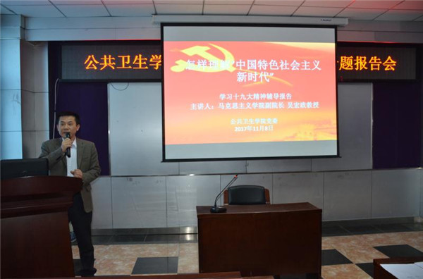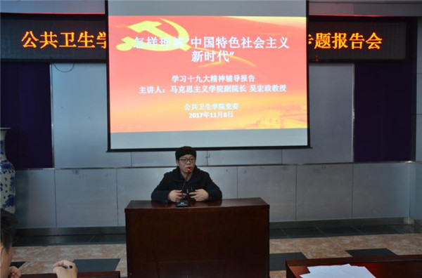 党的十九大精神宣讲团”成员、马克思主义学院副院长吴宏政教授为学院全体党员做了题为《怎样理解“中国特色社会主义进入新时代”》的专题学习辅导报告。学院领导班子成员、党委委员、党支部书记、教工党员、民主党派和无党派人士参加了报告会,会议由学院党委书记赵国利主持。