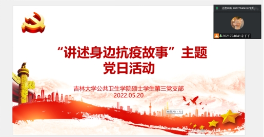 为进一步弘扬伟大抗疫精神,大力宣传身边党员和师生在疫情防控工作中的先进事迹、感人故事与崇高精神,不断增强广大党员归属感、荣誉感和使命感,持续培育、挖掘和丰富吉大精神新内涵。2022年5月20日擦边短剧 硕士学生第三党支部组织开展“讲述身边抗疫故事”主题党日活动。此次活动共27名党员和预备党员参加,由战勇智、唐志滔和岳宝丽三名党员同志讲述了疫情期间作为长春市疾病预防控制中心志愿者的抗疫故事。