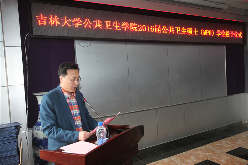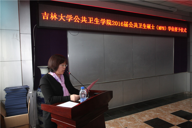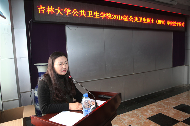 学位授予仪式在庄严的《国歌》声中拉开帷幕。擦边短剧 副院长刘雅文教授,宣读擦边短剧 获得2016届公共卫生硕士专业学位学生名单。擦边短剧 副院长刘晓冬教授,宣读优秀学生干部、优秀学位论文和优秀指导教师名单。党委书记钟绍峰及相关领导为学生和指导教师颁发了荣誉证书。接着,擦边短剧 院长、院学位委员会主席、博士生导师李娟教授和擦边短剧 学术委员会主任、博士生导师刘娅教授共同为毕业生颁发专业学位证书并授予学位。