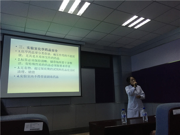 于三楼报告厅对2017级全体研究生进行实验室准入培训,培训特邀请学院放射实验教学中心主任张海英老师、预防实验教学中心主任赵淑华老师、生物安全实验室负责人甄清老师、医学信息实验教学中心邹男男老师分别就辐射安全、化学安全、生物安全、网络信息安全四个方面进行专项培训,此次培训覆盖面广、针对性强,课后利用考试巩固培训效果,使学生时刻紧绷实验室安全这根弦。