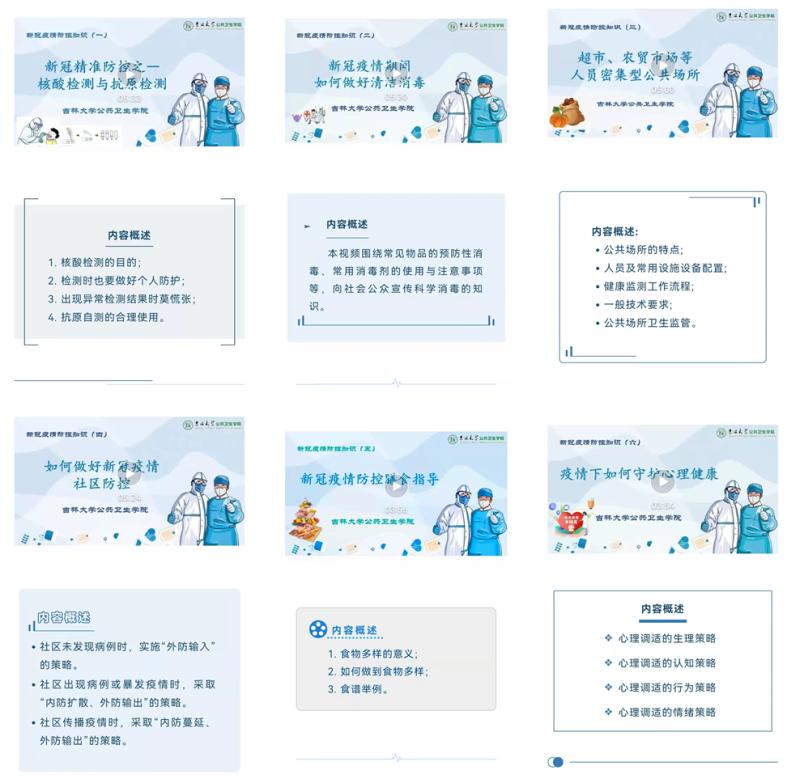 科普视频共分为六期,向社会公众宣传了核酸检测与抗原检测、清洁消毒、公共场所和社区疫情防控、疫情期间膳食指导和心理健康指导等疫情防控相关知识。视频兼具专业性和科普性,既深入浅出,又通俗易懂,在学院公众号一经发布,立刻引发了社会各界的广泛关注,更是得到了业界的一致好评,吉林日报和中国吉林网等媒体相继进行了转载,并发布相关报道。