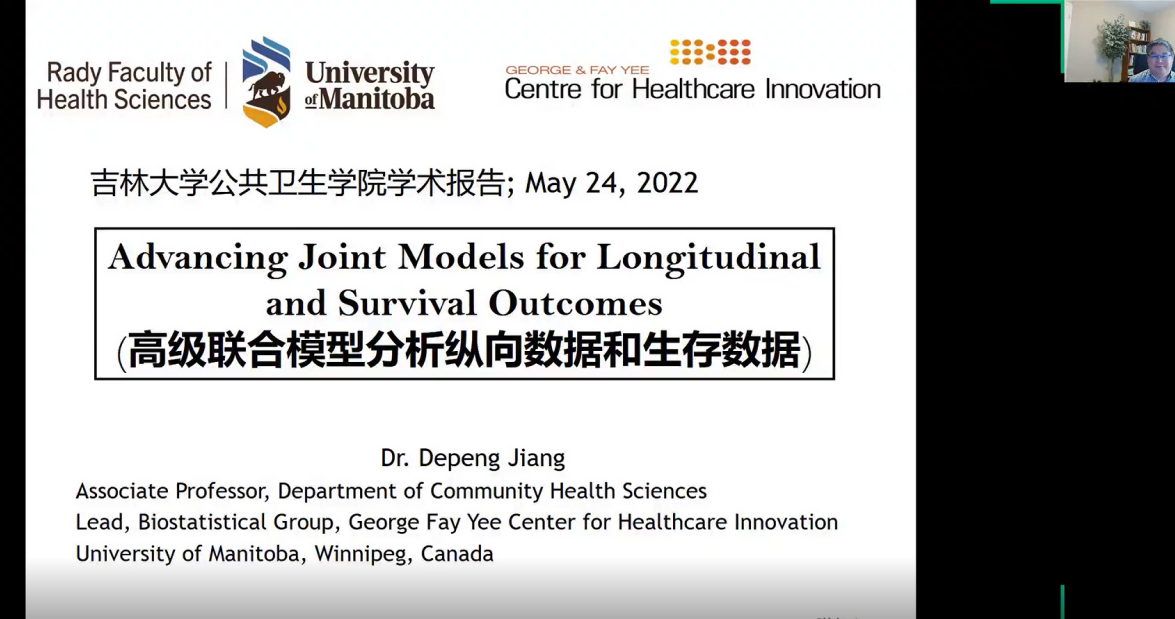 师生的统计分析能力,促进学院国际交流,应学院邀请,加拿大曼尼托巴大学公共卫生学系蒋德鹏教授于2022年5月24日线上做了题目为《高级联合模型分析纵向数据和生存数据》的学术讲座。擦边短剧