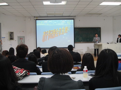 会议由学生会秘书部张曦月主持。首先,前任学生会主席刘畅上台演讲,她回顾了过去四年在学生会的工作经历,对学院老师和同学们的支持表示感谢,并鼓励新一届学生会继续做好学生服务工作,再创辉煌。紧接着,新一届主席王政民发表讲话,他就学院的未来发展提出了自己的构想,对学院活动的主题方向提出了“学习相关,生活相伴”。随后,在全体与会人员的掌声中,两任主席进行了学生会年鉴的交接。接着,吴晓辉主任宣读聘书,学院领导和老师为学生会主席、副主席、各部部长颁发了聘书。