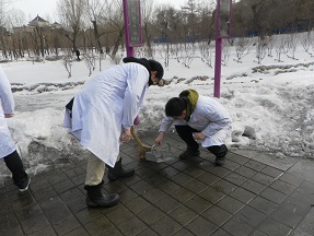 志愿者们身着代表着医学生身份的白大衣,手持扫把、簸箕和抹布等清洁用品在教学楼前集合后,徒步前往朝阳公园。寒冷的天气挡不住同学们“学雷锋”的热情,厚厚的积雪掩不住同学们志愿服务的干劲,大家自动分成几组,清扫健身区域内的积雪和垃圾,用抹布将健身器在上的污渍擦拭干净。经过一个多小时的紧张劳动,同学们成功完成了今天的工作。期间,正在锻炼的市民对同学们学习雷锋的行为赞不绝口,并表示将把这种学习雷锋的精神继续传递。