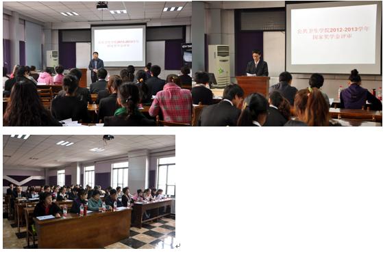 办公楼三楼报告厅举行了2013学年国家奖学金评审活动。医药信息与卫生管理学系主任王伟教授、预防医学系刘雅娟教授、放射医学系刘丽波教授、医事法学系刘畅老师,以及学生工作办公室主任吴晓辉,各年级辅导员曲超、李茵、苏国范、郭倩君作为评委出席了本次评审活动,对12级至09级的29位国家奖学金候选同学进行评定。