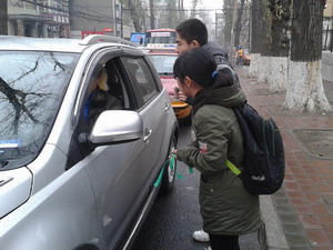 正午时分,雪花飞舞,车况正堵,但这丝毫不影响绿野协会成员们对低碳生活的宣传热情,他们良好的沟通能力和亲切的笑容赢得了诸多私家车车主的配合和赞许。同学们向堵车中的私家车车主宣传了本次活动的环保主题——“少开一天车”,讲述了少开车的好处以及低碳环保理念等;并邀请私家车车主合影留念,记录下他们的车牌号以鼓励督促,最后赠予了绿丝带。本次活动长达一个小时,共赠出43条绿丝带,获得了圆满成功。