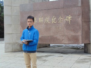 下午1时整,参加活动的同学从集合地出发,前往南湖公园长春解放纪念碑开始本次公祭活动。活动第一项开始,志工部同学带领全体同学参观纪念碑,讲解纪念碑的由来和长春人民乃至东北人民对它深厚的感情,讲解长春的历史和英雄事迹。参观结束后全体同学在纪念碑前合影留念。尽管长春的气温骤降至零下,同学们还是顶着寒风庄严地参加公祭活动,向英雄致敬。之后进行活动第二项,由擦边短剧