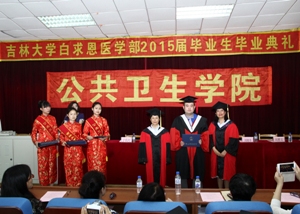 能够硕果累累,桃李满天下。接着,学生朋辈心理辅导员吴功华同学及学生代表向毕业生赠送祝福小礼物,2015届全体毕业生也向母校回赠纪念品,向母校表达深深的感激之情。社会医学与医事法学系主任杨淑娟教授代表教师为毕业生送上寄语。在寄语中,杨老师表示学院老师会一如既往的关注、关心、关爱全体毕业生,同时也希望毕业生们在未来路上可以诚实守信,关爱健康,勇往直前。