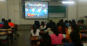 团委学生会组织全体成员于一教301教室共同观看纪念中国人民抗日战争暨世界反法西斯战争胜利70周年庆典暨阅兵式直播活动。