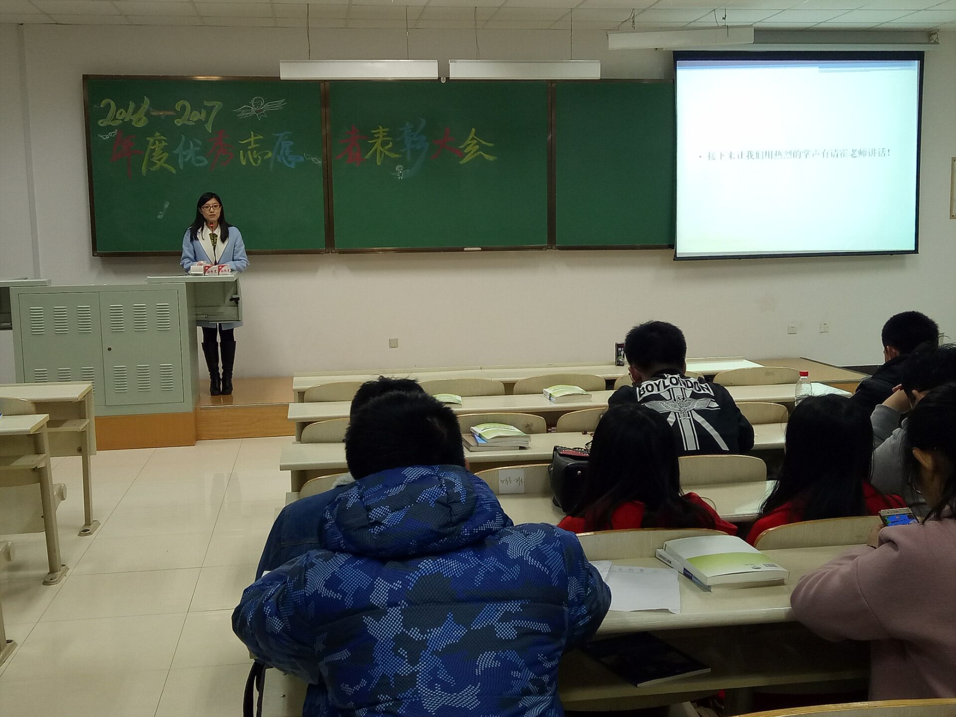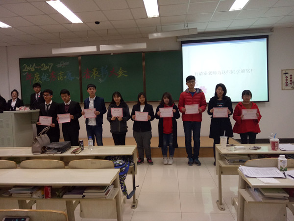 2016年度优秀志愿者表彰大会在中心校区李四光楼202教室举行。2016级辅导员霍睿参与了本次大会,并为获奖学生颁奖。