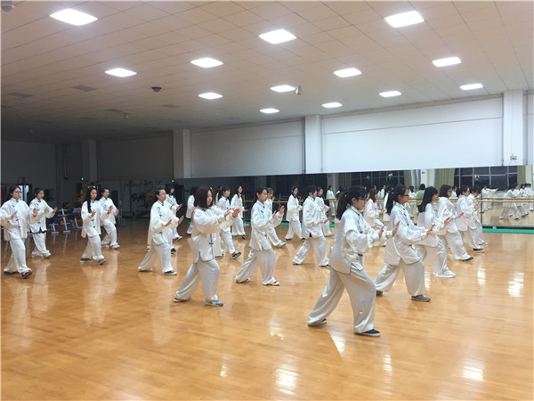 在前期近一个月的赛前练习中,在动作的熟练程度、相邻动作之间的衔接等方面,同学们的表现可圈可点。作为运动会预赛之前的最后一次预热,本次集中训练,主要以队列动作的整齐程度为主要练习内容。训练伊始,同学们首先练习了两次太极拳全套动作。随后,在学生会学习部部员的指导下,大家对左、右下势独立、转身搬拦捶等几个要求较高的动作进行了重复练习,其间偶尔穿插了对个别动作的精细调整。训练的最后二十分钟时间里,同学们统一换上了太极拳比赛服装,将比赛时从入场到退场的整体流程熟悉了几遍,真正做到了赛前全面而又充分的准备。