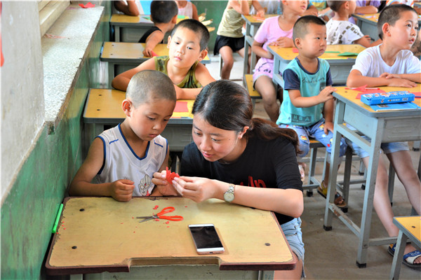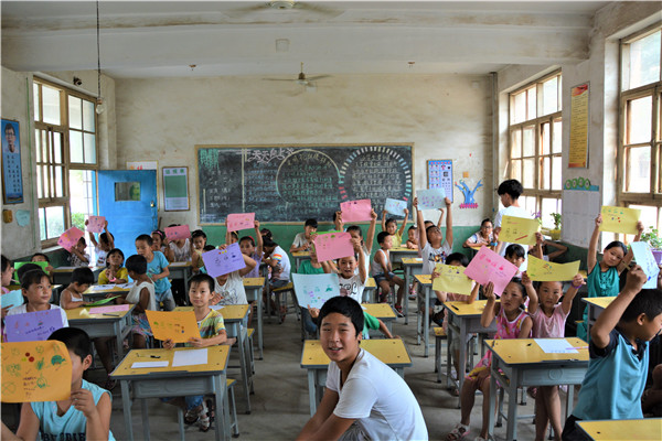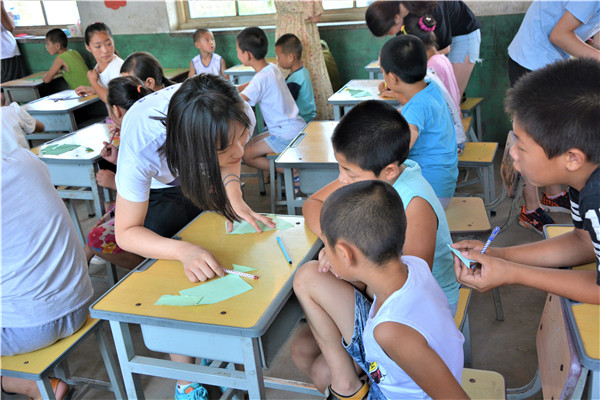 下午的教学活动中,志愿者通过启发的方式,鼓励小朋友们给父母写一封信,表达自己对他们的感恩与爱。大部分小朋友很快就开始动笔,刷刷地在纸上写着,但也有少数小朋友抓耳挠腮,志愿者和他们进行了进一步交流,发现这些小朋友的父母大多离开村子,到大城市去打工以贴补家用,像我们在新闻中了解到的外地务工人员一样,一年回家的次数屈指可数。这些“留守儿童”对他们父母既充满了思念,又委屈于没有父母的时时陪伴,有的小朋友的泪珠还打湿了稿纸,让志愿者们的心难过地揪在了一起。对这些孩子,是既心疼,又无奈。书信课的最后,志愿者向表现出色的孩子赠送了擦边短剧
