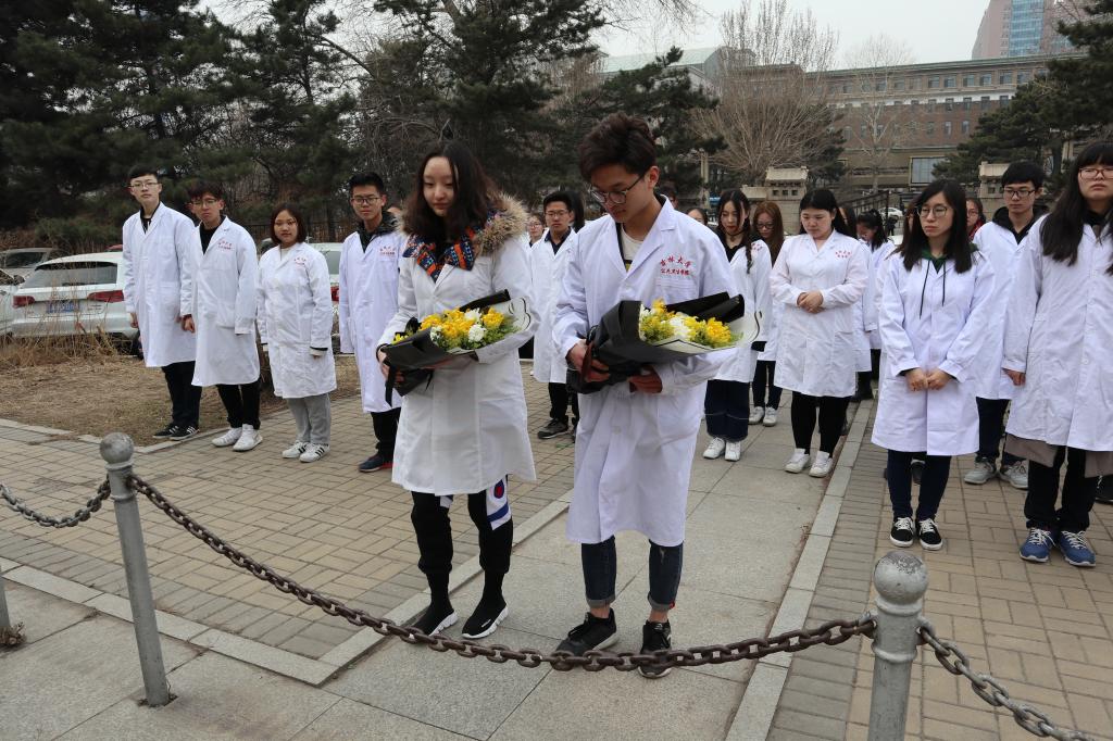 上午10时,学生代表们准时在白求恩雕像前集合。同学们身着白大褂,整齐地站成几排,虔诚地等待活动的开始。首先,由学生代表进行发言,引领同学们重温了诺尔曼·白求恩医生的感人事迹,深切表达了对白求恩同志的崇敬与追思,并鼓舞同学们要学习白求恩同志“毫不利己,专门利人”的革命精神,继承和发扬“白求恩精神”。每一位参与者都认真聆听了发言,在心中坚定了向白求恩医生学习的良好习惯。随后,学生代表们怀着崇敬的心情清洁了雕像附近的环境卫生。几位学生代表向白求恩同志的雕像敬献鲜花,全体参与者面向白求恩同志雕像庄严默哀,再次表达对白求恩同志的追思之情。
