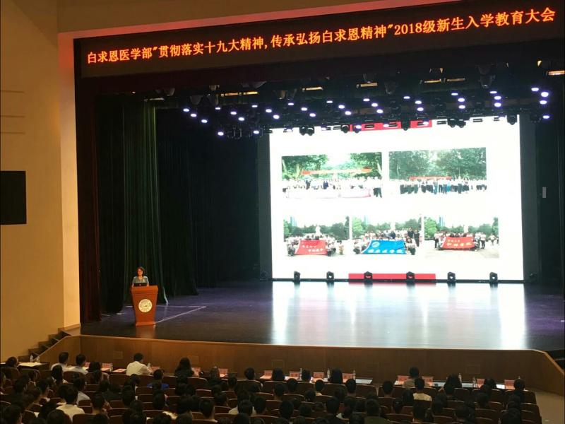 为传承和发扬白求恩精神,加深新生对白求恩医学部的归属感、荣誉感、责任,8月27日上午8点,白求恩医学部在中心校区鼎新大礼堂举办2018级新生入学教育大会。首都医科大学附属友谊医院主任医师、白求恩医科大学北京校友会会长尤红出席了本次会议。
