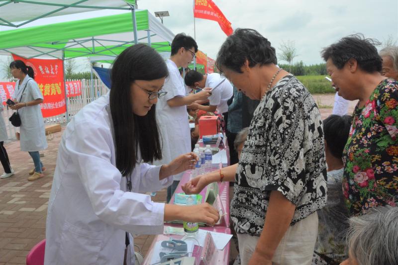 8月7日,团队到达通榆县乌兰花镇陆家村,陆家村负责领导向团队介绍了陆家村的概况和村民的生活状况,并向团队的到来表示了热烈欢迎。“健康扶贫”行动的第一天,志愿者们为村民们进行了健康义诊,义诊项目主要分为布鲁氏杆菌(简称布病)调查、采血检测、健康手册及防护用品发放和健康指标检测。负责布病调查的团队成员,迅速逐一给村民进行调查,调查结束后,引导村民进行采血检测,为村民们免费筛查布病并及时向村民反馈结果。其中,整个义诊活动中最受欢迎的是健康指标检测,团队利用全科检测仪,对村民们进行可自选的二十五项身体健康指标检测,实时打印检测结果,并向每位村民解读其个人指标信息。村民们热情高涨,积极配合,使义诊活动井然有序地开展着。