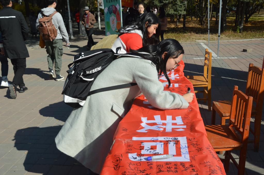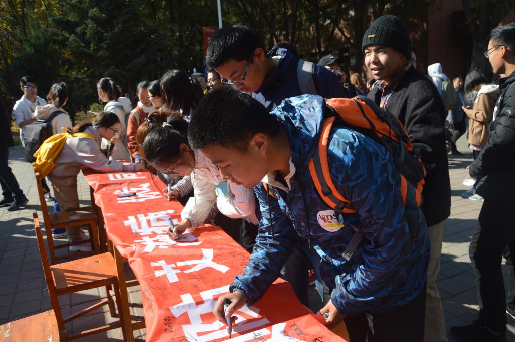 2018级同学们早早抵达现场进行场地布置,大家一起合力搭建展板,具体内容包括:介绍艾滋病病源、传播原因、临床表现及防治方法等相关知识。与此同时,同学们向路过的其他学院同学们发放艾滋病知识宣传手册。中午十二时,活动正式开始,陆续来到活动现场,在工作人员的带领下戴上了防范艾滋病的标志徽章,并在宣传条幅上签名以表示对祖国“防艾”事业的支持。随后,工作人员引导同学们观看了展板上的艾滋病相关知识,并正确客观地解答了同学们的疑问。由于本次活动形式新颖、内容充实,也吸引了许多外国友人参与。活动最后,同学们与工作人员共同在展板前合影留念。