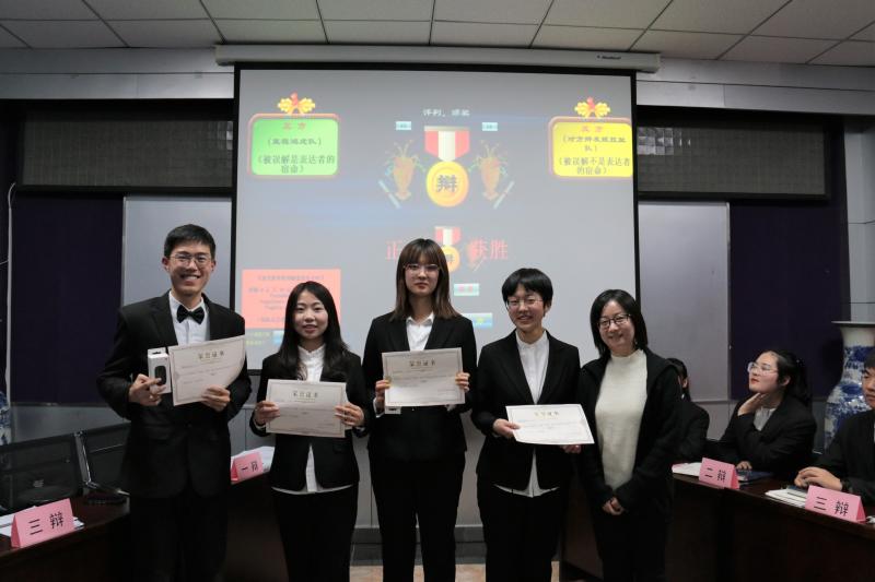 参加本次辩论赛决赛的两支队伍分别是由张书涵、于书冉、冯一苗、王羽丰同学组成的正方队伍,和由韦海玉、赵娟、刘先统、李春美同学组成的反方队伍。在比赛规则宣读完毕后,双方队伍侃侃而谈,分别阐述己方观点;随后进入一对一质询环节,双方辩手用犀利的语言对对方辩手的观点进行驳斥,并提出己方观点,比赛场面扣人心弦、紧张异常;接着是自由辩论环节,双方辩手唇枪舌战、气势如虹,将比赛气氛推到高潮,场下观众激情澎湃、掌声不断;最后,双方四辩总结陈词,归纳对方漏洞,完善己方观点。比赛结束后,经过评委们鞭辟入里地点评和仔细地商讨,最终评选正方队伍获胜,反方三辩刘先统同学荣获最佳辩手,评委们为他们颁发了证书和奖品。