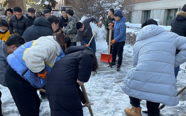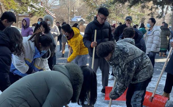组织在校教师与研究生清扫院内积雪,清雪活动得到了全体师生的积极响应,师生有序分工,头顶寒风,相互配合,共同克服积雪厚、天气冷等困难,以饱满的热情和充足的干劲铲冰清雪,活动现场大家享受着劳动中的愉快欢欣,脸上都洋溢着灿烂的笑容。师生们充分发挥团队精神,齐心合力、团结合作,经过一个多小时的共同奋战,院内积雪基本清理干净。