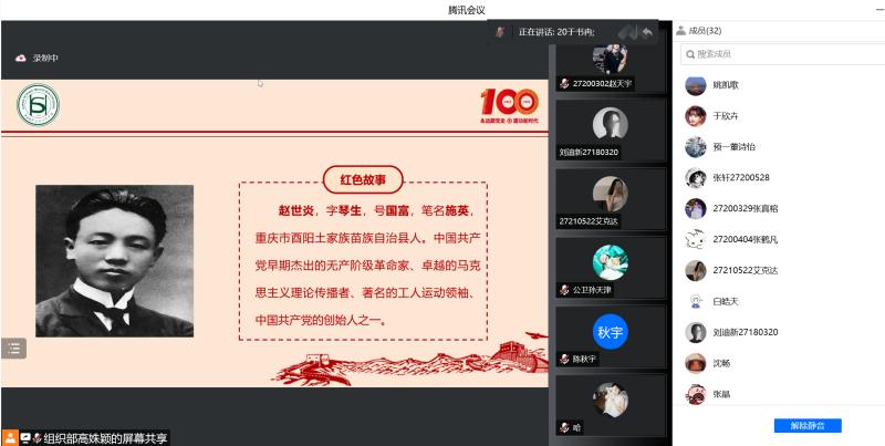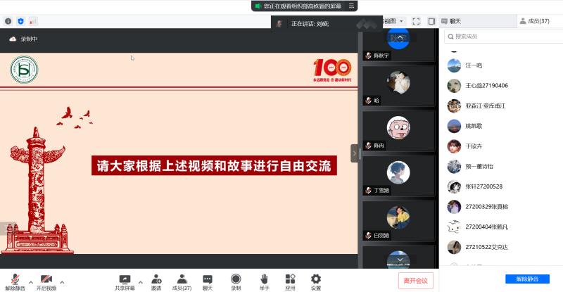 本次主题沙龙开始,参与人员共同观看一段有关团史的视频。随后,2020级于书冉同学为大家分享了中国共产党创始人之一——赵世炎的红色革命故事。接下来,由同学们自由交流观看感受。