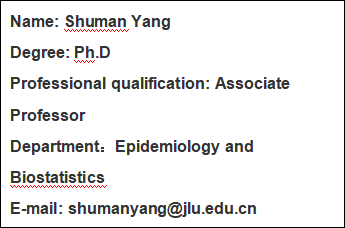 • April/2017-now, Department of Epidemiology and Biostatistics, School of Public Health, Jilin University, Jilin, China