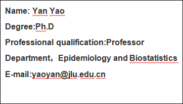 • Jin L, Guo X, Dou J, Liu B, Wang J, Li J, Sun M, Sun C, Yu Y, Yao Y. Multimorbidity Analysis According to Sex and Age towards Cardiovascular Diseases of Adults in Northeast China. Sci Rep. 2018(通讯作者)